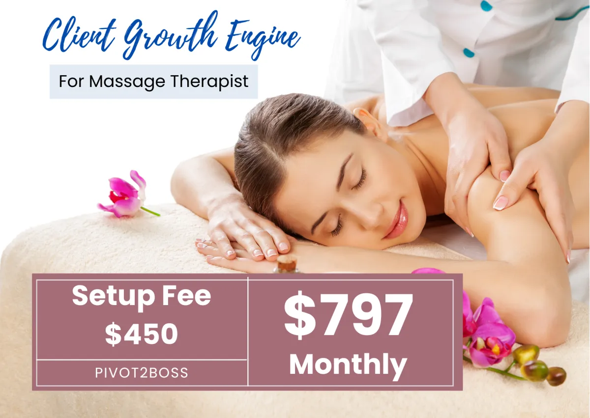 The Client Growth Engine is a 100% done-for-you client acquisition system built for solo massage therapists who are sick of relying on referrals, last-minute rebookings, and wishful thinking.
